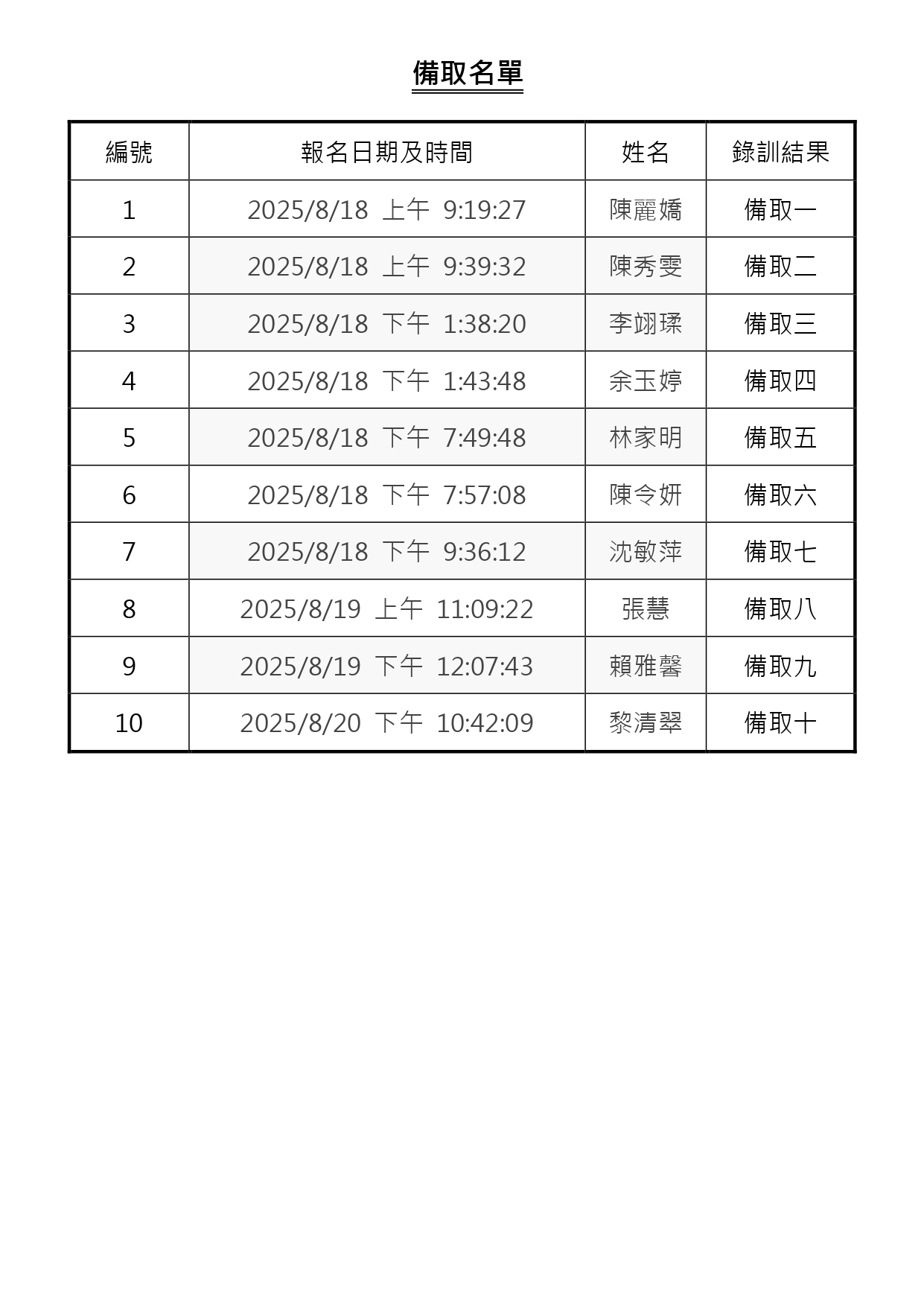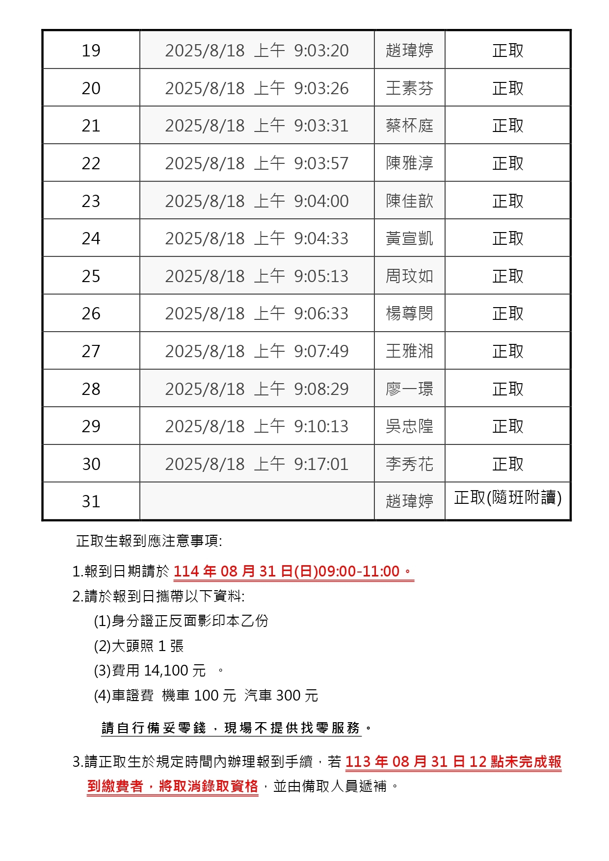 3. 請正取生於規定時間內辦理報到手續,若114年08月31日13點00分前未完成報到繳費者,取消錄取資格,由備取人員遞補。