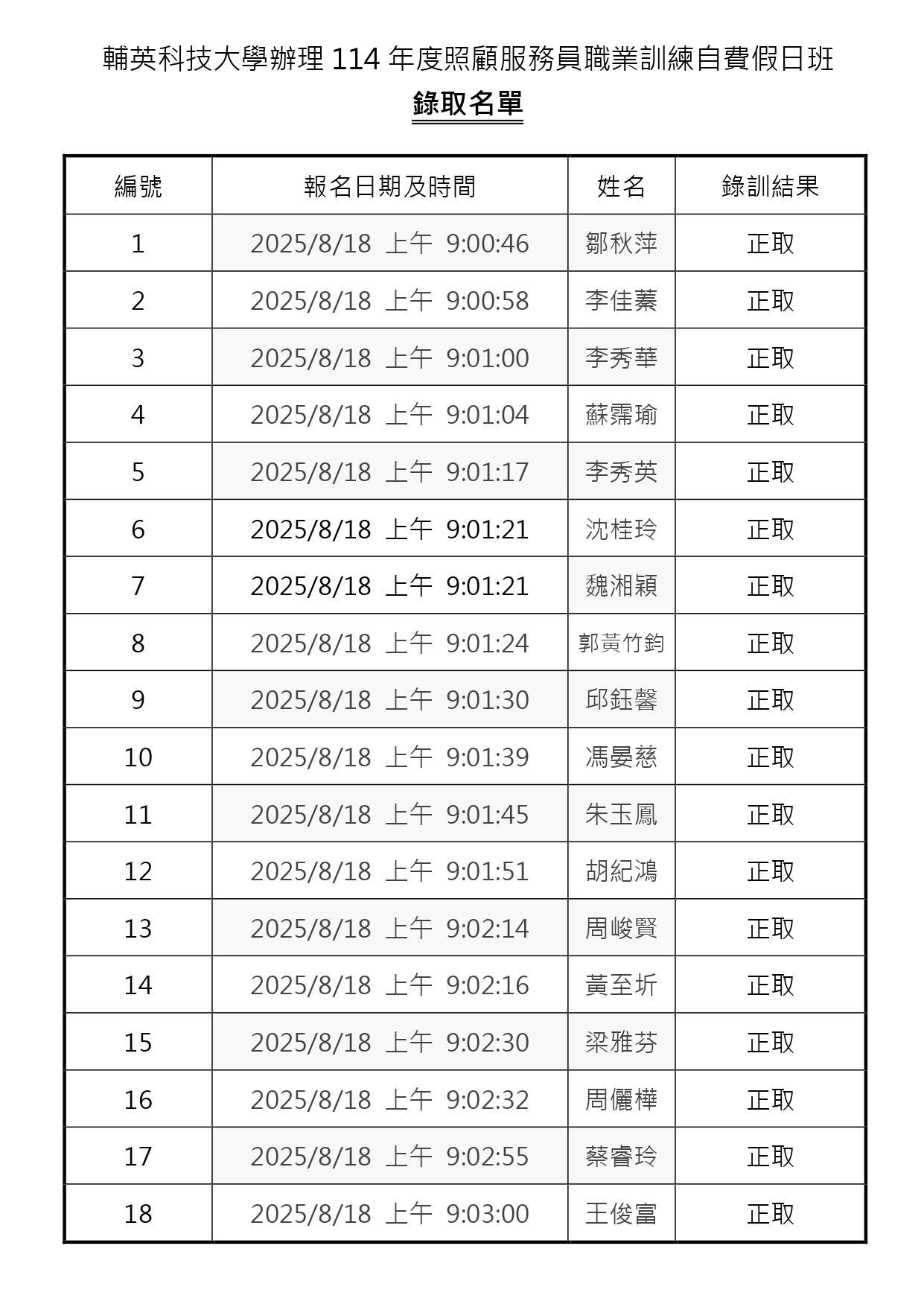 114年 照顧服務人員職業訓練 職前自費假日班 錄訓名單