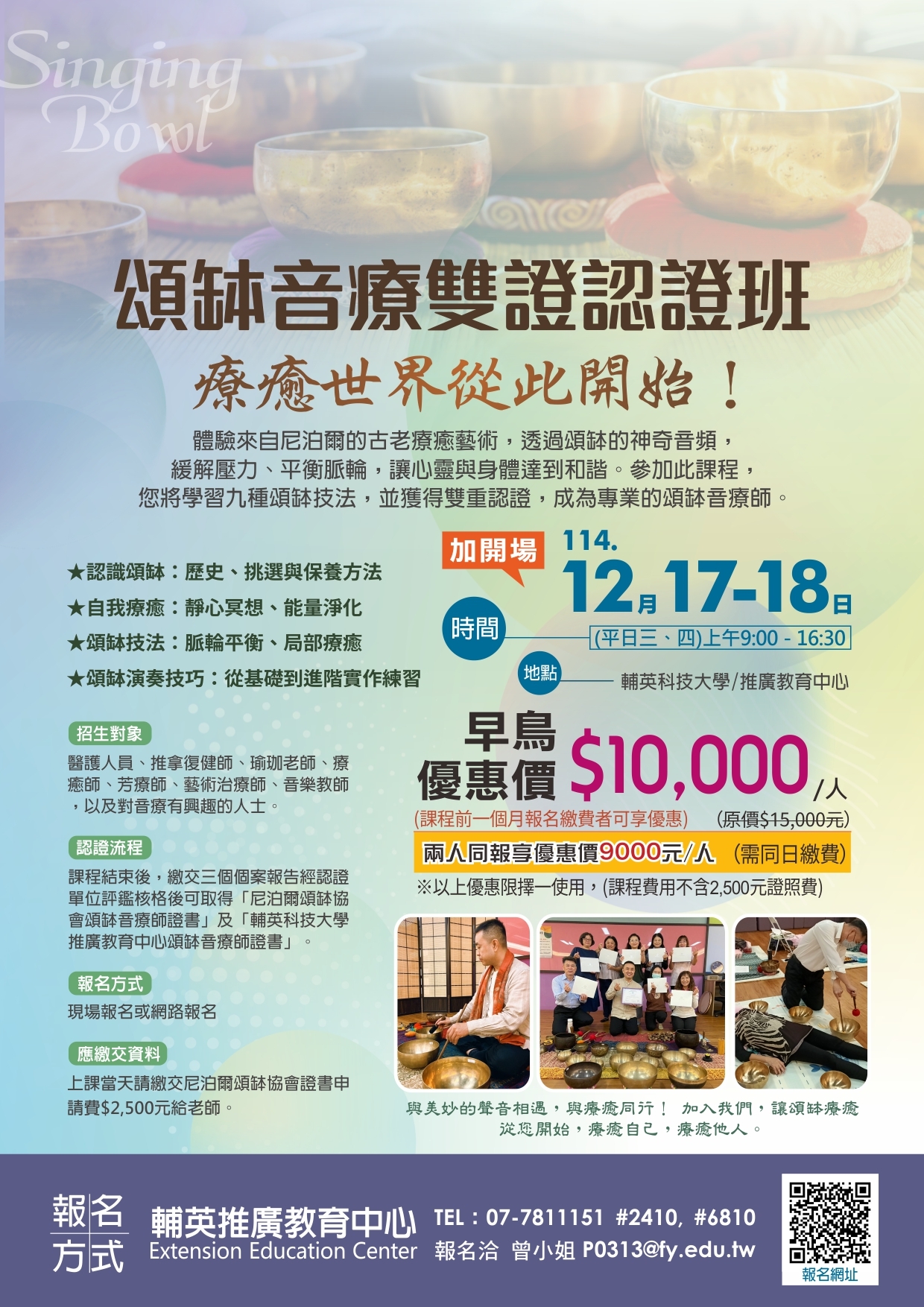 輔英科技大學推廣教育中心頌缽音療師證書 |