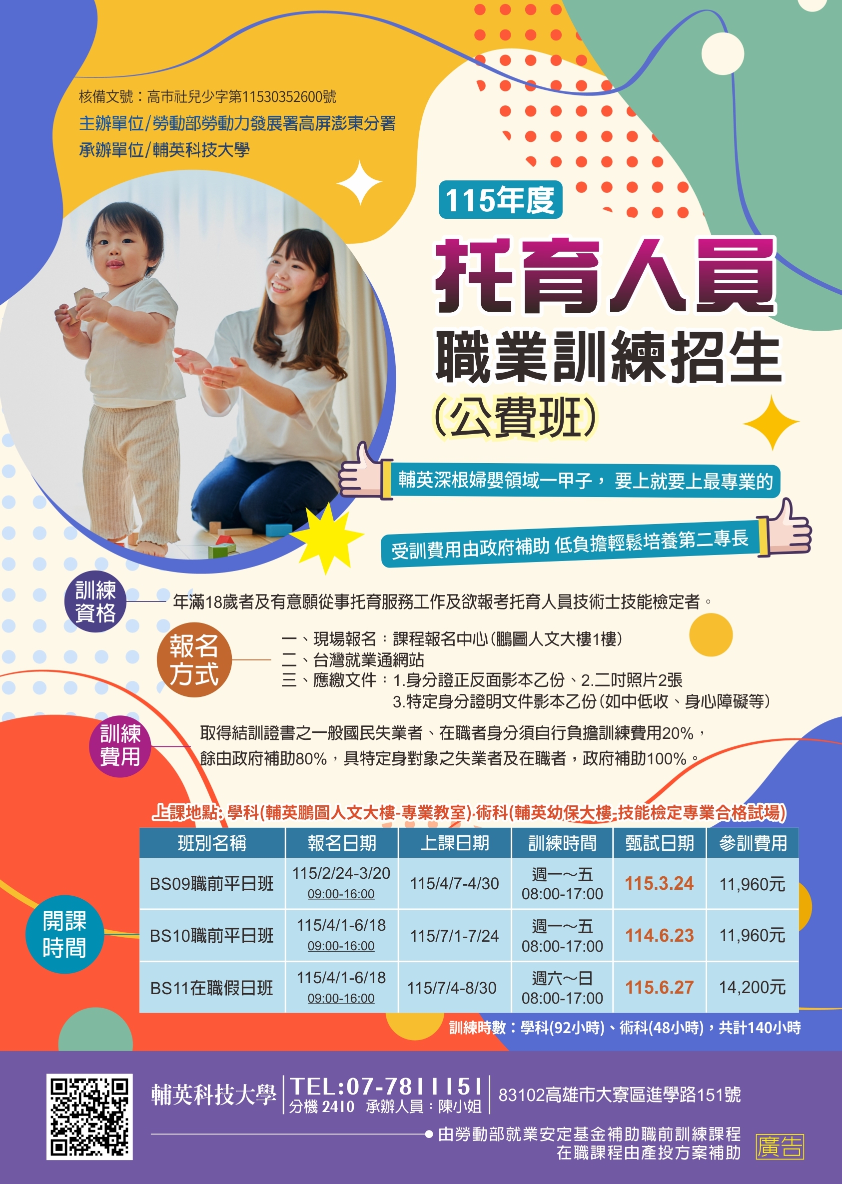 高雄托育人員課程|輔英科技大學托育人員訓練班|政府補助最高100%